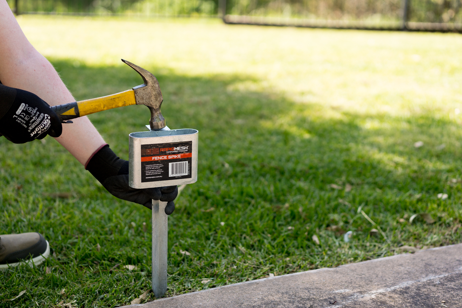 The temporary fence support spike is a lightweight and practical alternative to the traditional concrete filled support block used to support RapidMesh temporary fence panels. The small square steel tube of the support spike accommodates the bottom legs of the temporary fence. You just need a normal hammer to drive it in to place to ensure your fence stays upright and supported.