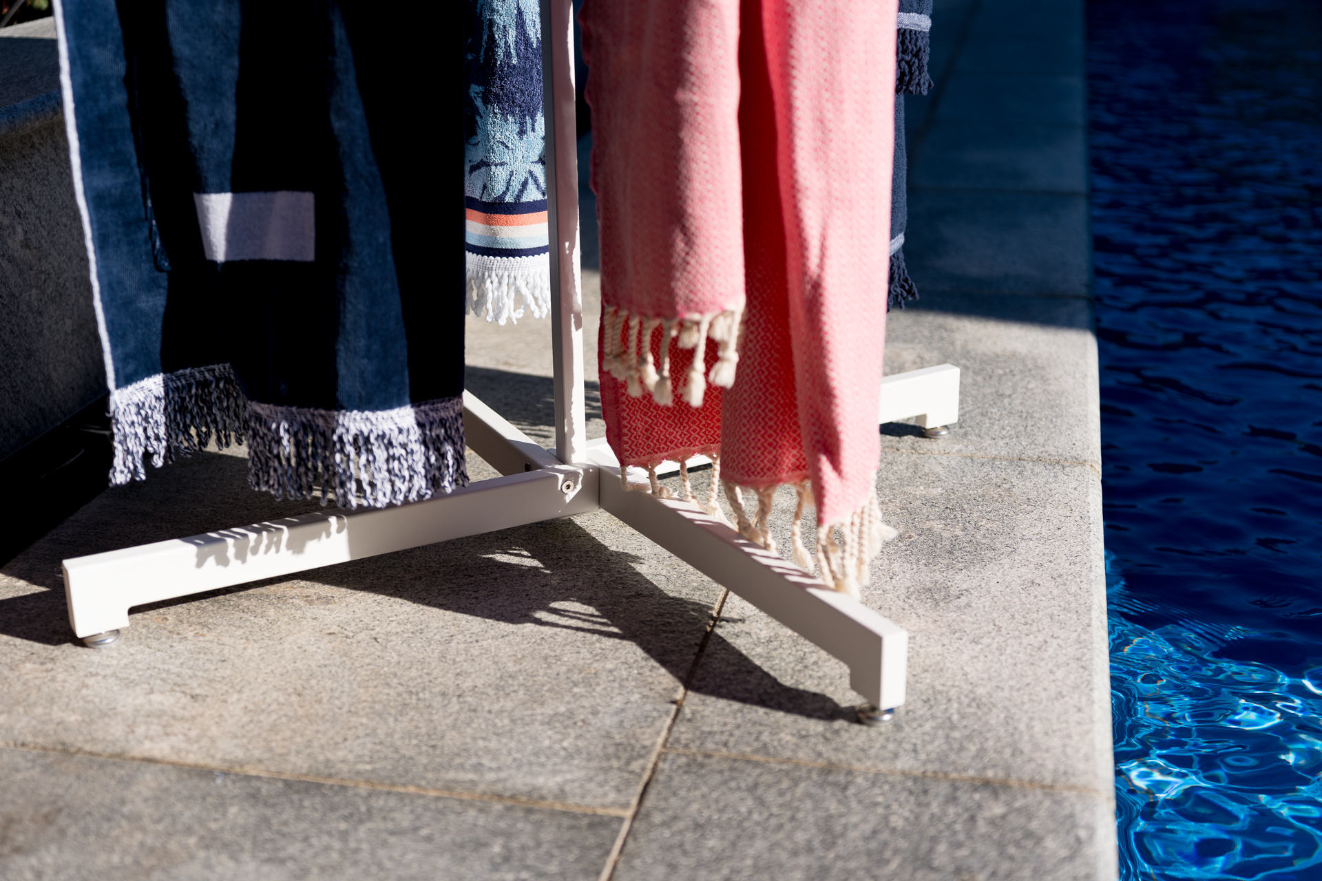 This sleek and modern white towel stand, measuring 870mm x 870mm x 1040mm, is perfect for keeping your towels organized and within easy reach. Whether in your bathroom or by the pool, this stand adds a touch of elegance to your space.